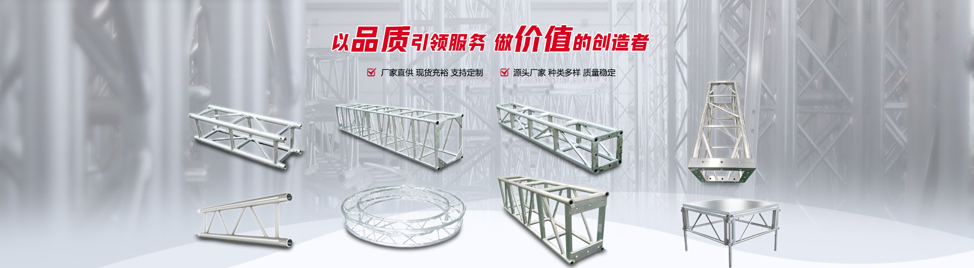 公司主要生產各種規格型號的鋁合金桁架、鋼鐵桁架、鋼鋁雷亞架、腳手架、鋁合金快裝舞臺、鋼鐵升降舞臺、防爆欄、看臺、合唱臺等器材,也可根據客戶要求設計定做產品,廣泛服務于婚慶、演出、展會展覽、文化傳媒等行業。